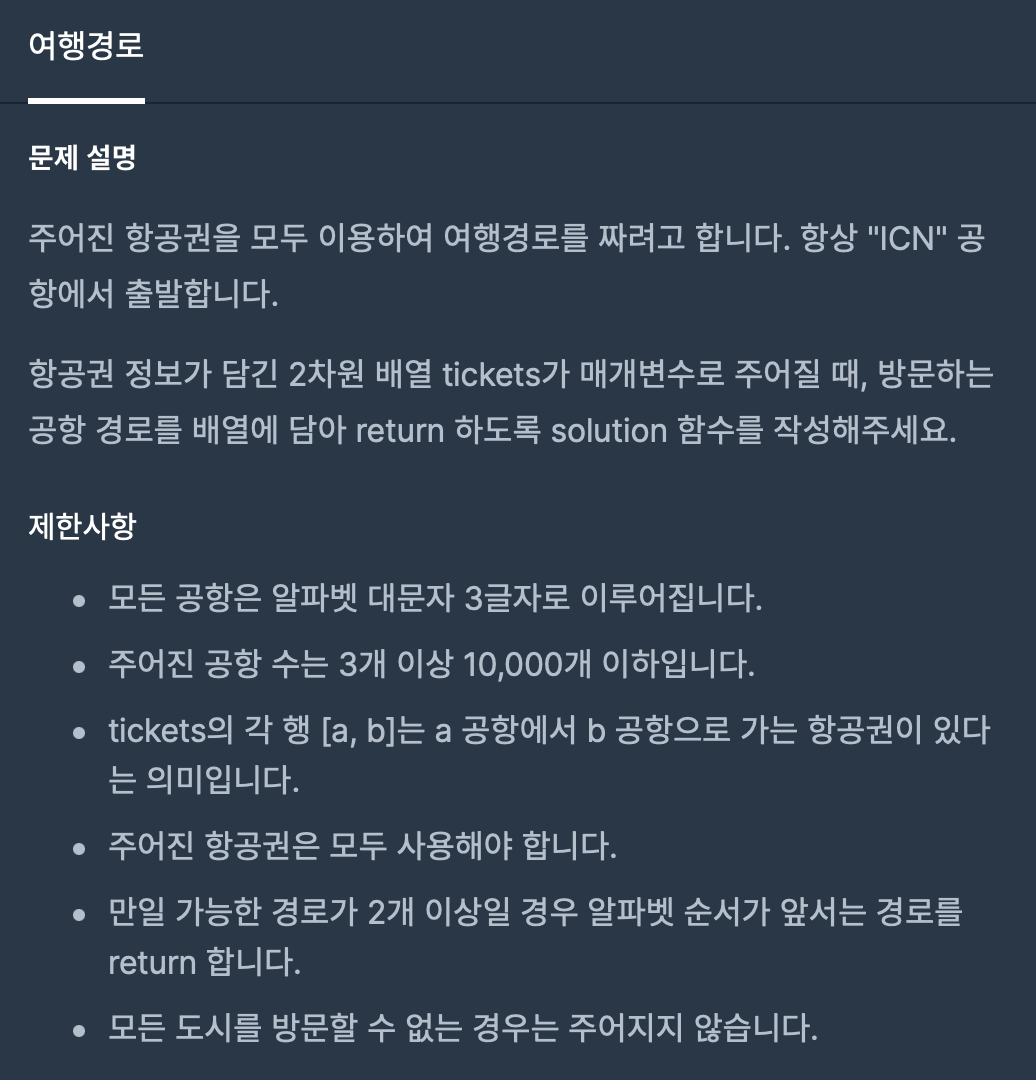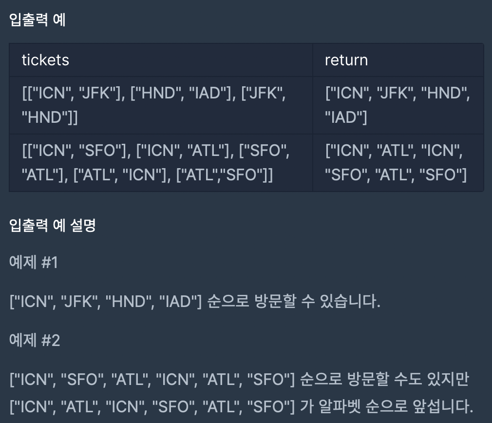 TC 1번은 경로가 같은 것이 2개 이상 있어서 알파벳 순으로 앞선 것을 고려해야 맞는다고 하는데, 단순히 tickets를 정렬해서 해결될 문제는 아닌 것 같다.