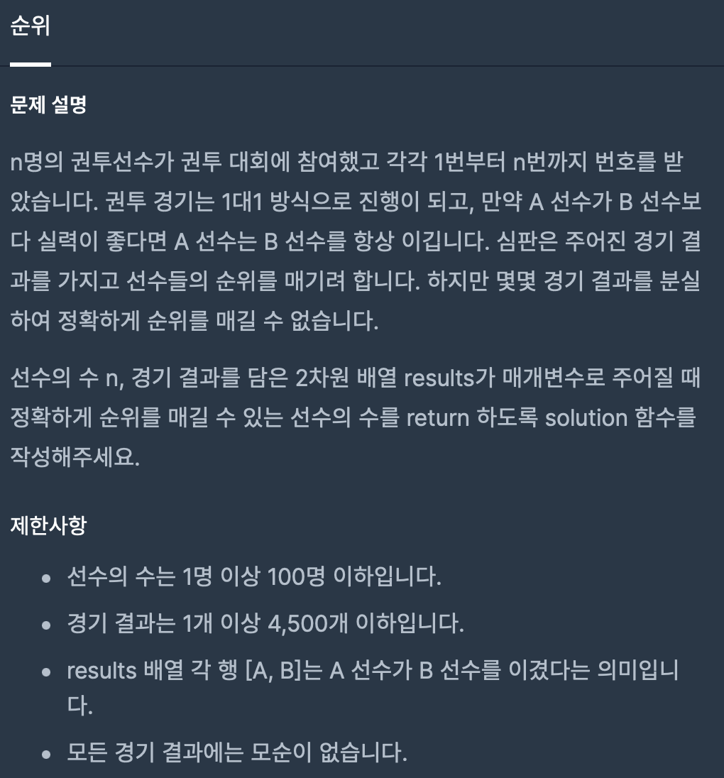 if (graph[i][j] || graph[j][i]) //i가 j에게 이겼거나 졌거나 정보가 n-1개면 순위 예측할 수 있다.
