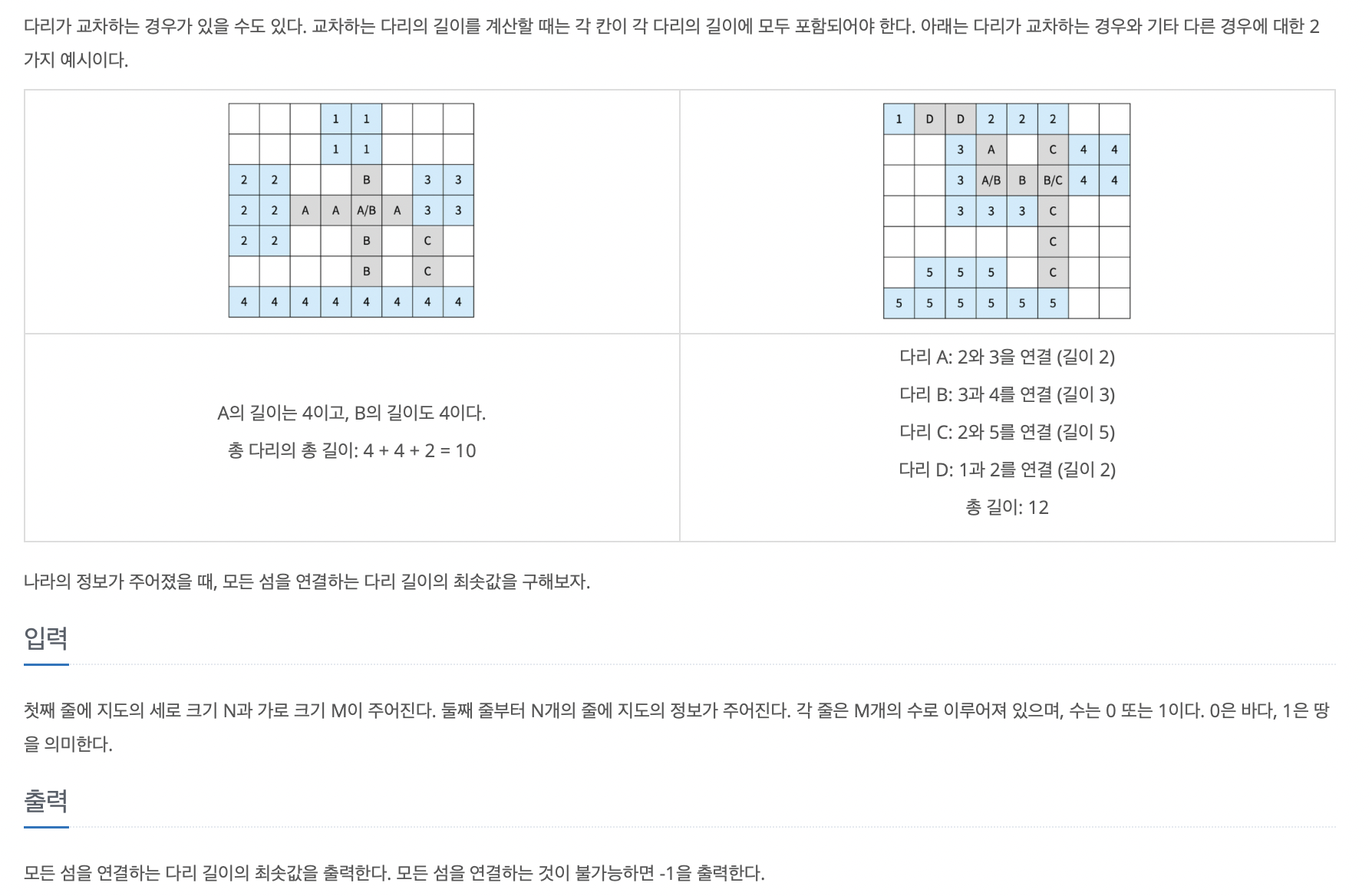 4. 섬과 섬 사이의 다리 길이가 두 섬에 대해서 여러 개 일경우 가장 짧은 다리를 선택한다.