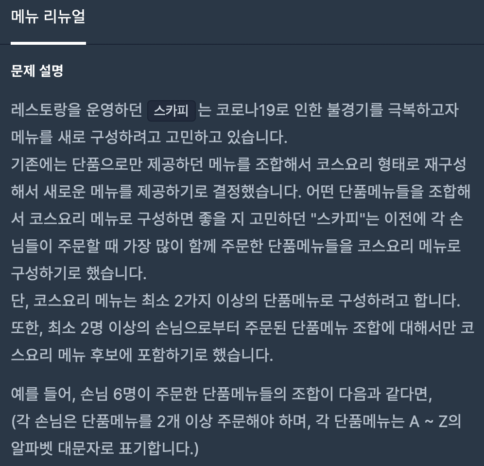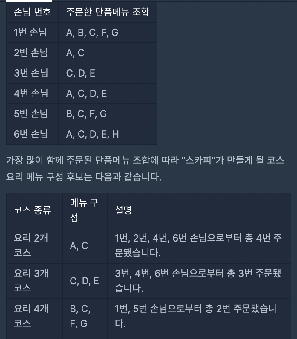 주문한 메뉴(string)에 대해 course 메뉴의 개수만큼(2, 3, 4 ...) substring을 구하여 vector에 저장한 뒤, 가장 많이 주문한 코스 메뉴 조합을 answer에 추가하여 return하면 된다.