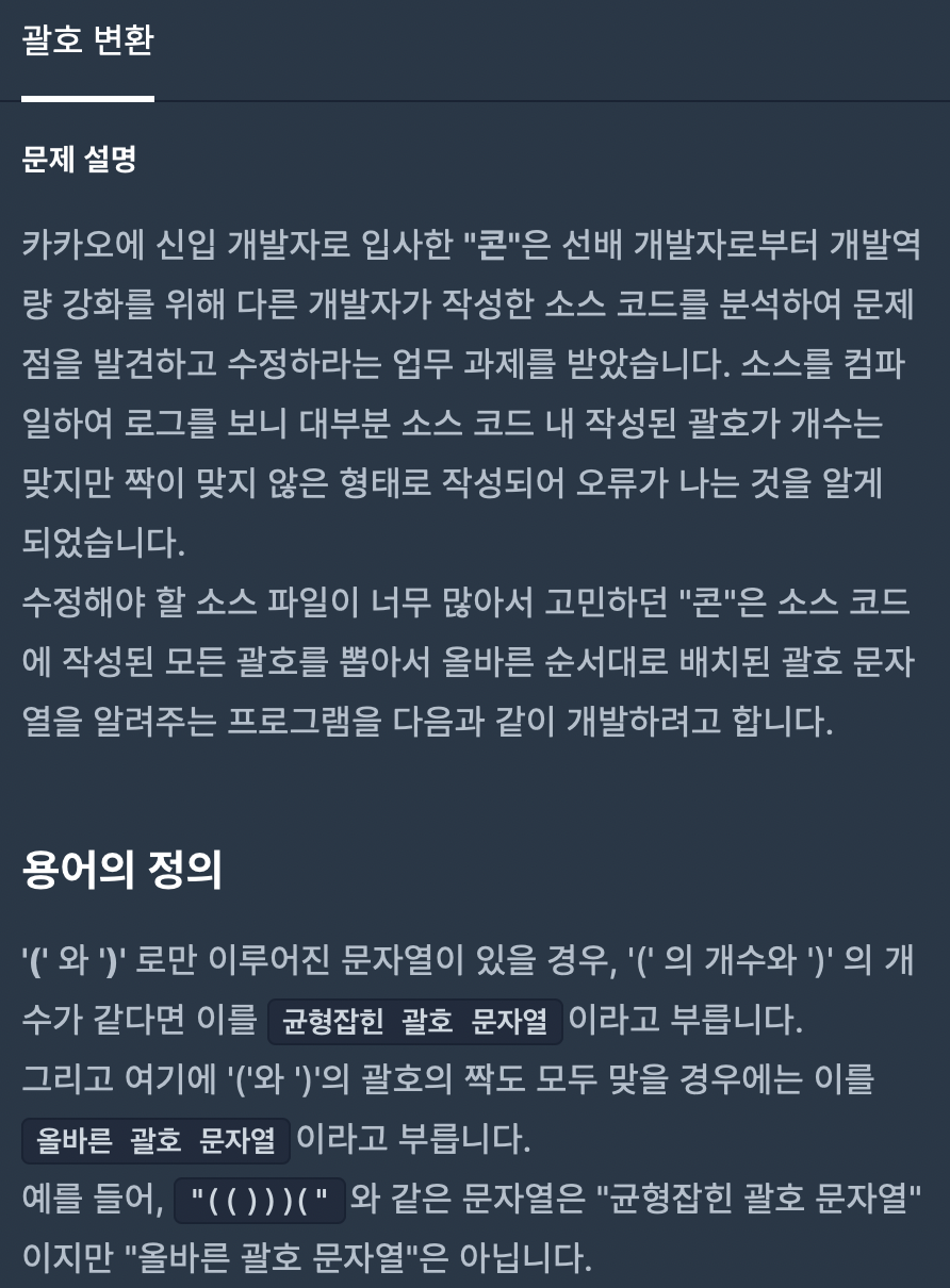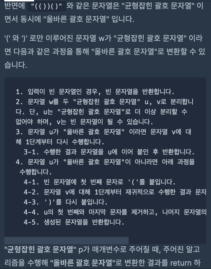 너무 어렵게 생각하지 말고 우선 p 전체를 매개변수로 넘긴 후, 균형잡힌 문자열이 될 때 까지 문자열을 u, v로 나눈 후 나와있는 로직을 그대로 수행하면 된다. u와 v로 나누었을 때, u가 올바른 괄호 문자열이라면 v에 대해 다시 재귀적으로 올바른 괄호 문자열을 구하여 u에다가 더한 뒤 반환하라고 되어 있으므로 그대로 구현해준다.