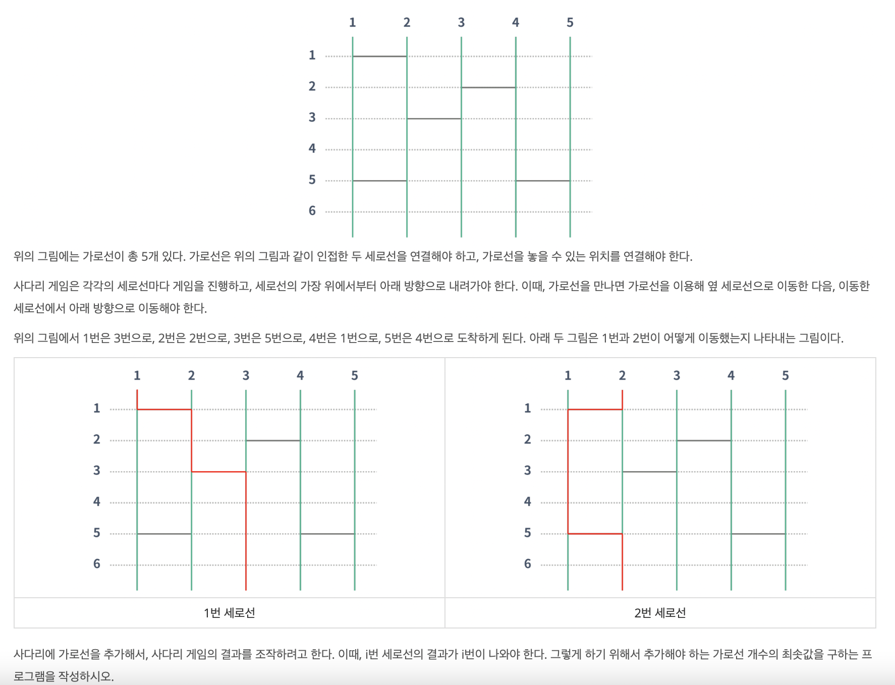 i 번 세로선의 사다리 게임 결과가 i가 되게 하기 위해 최대 3개의 가로선을 추가할 수 있다고 할 때 백트래킹을 이용하여 모든 경우를 완전탐색하는 문제이다.