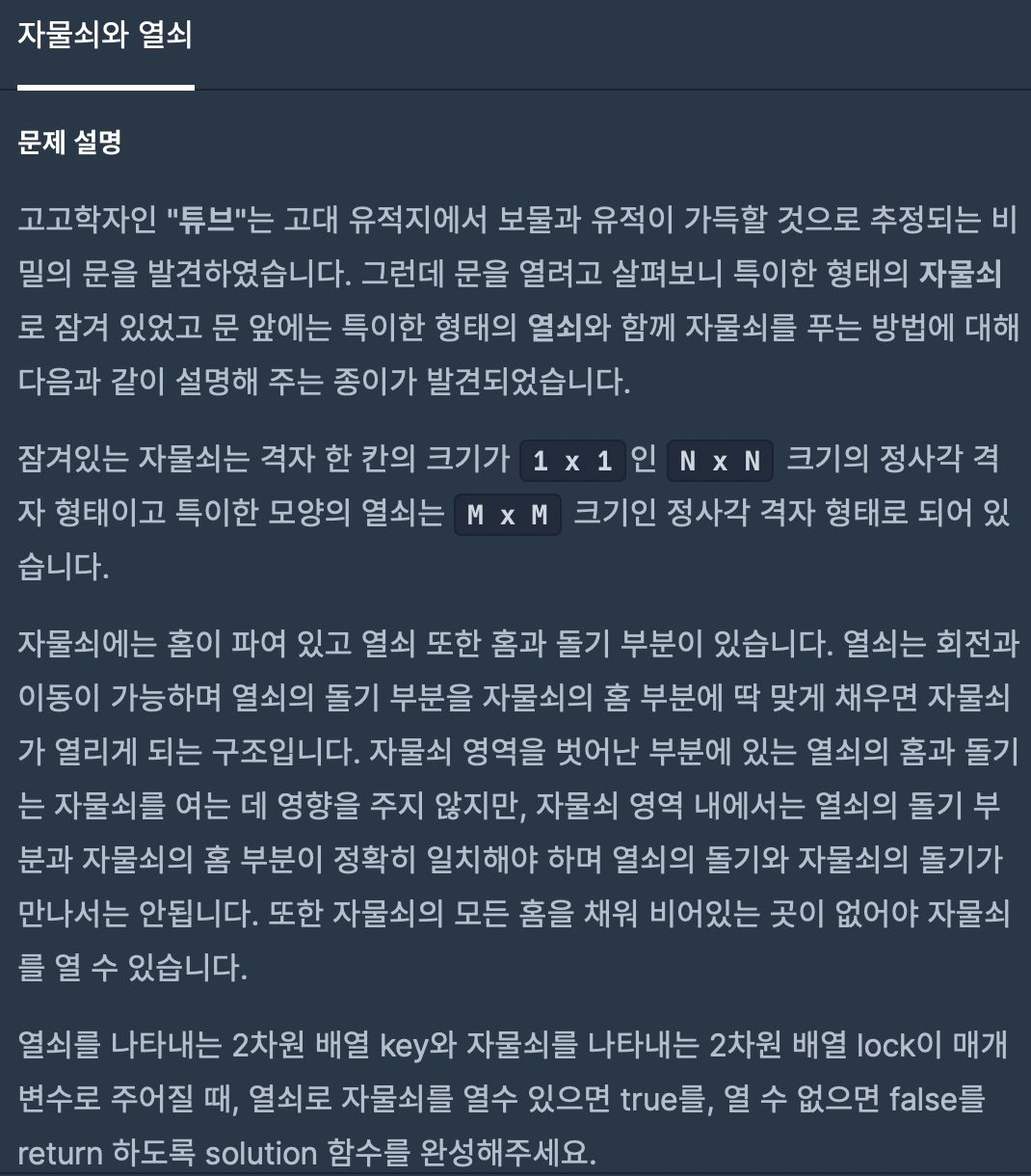 key를 시계방향으로 90도 회전시키는 함수를 구현하고, key와 lock 배열을 비교하면 된다.