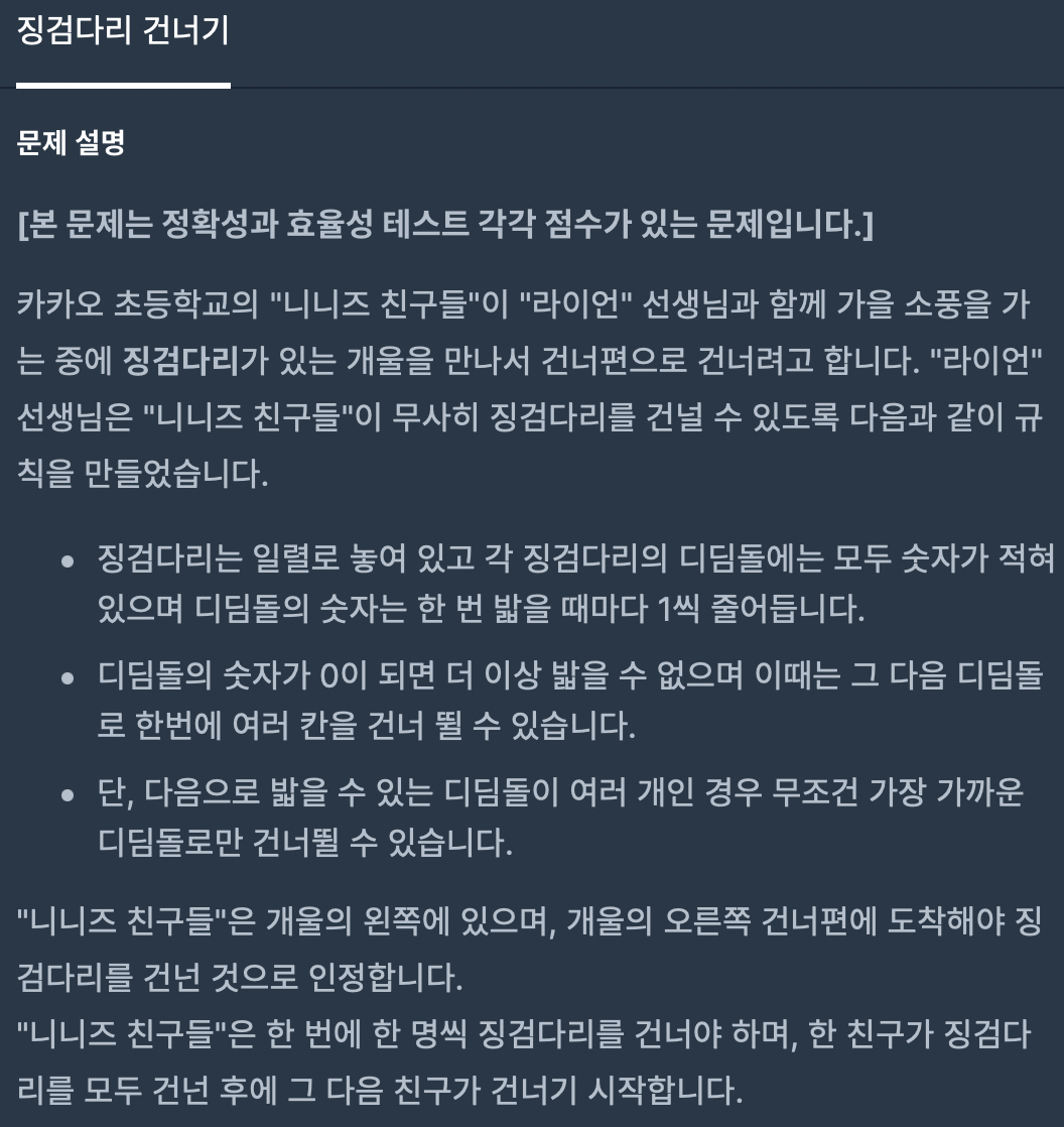 우선 stones의 배열의 크기가 20만까지 이므로 O(N^2)으로는 효율성 검사를 통과할 수 없다.
