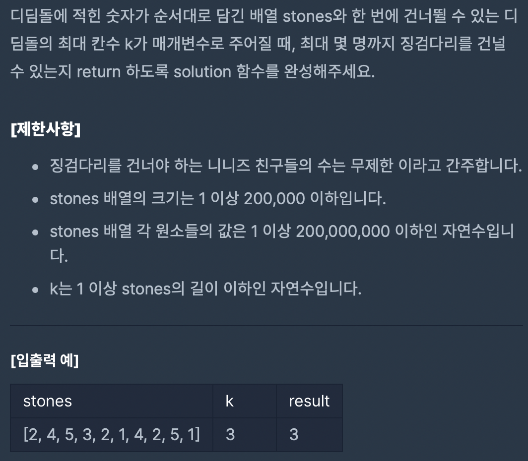 stones 배열에서 앞에서부터 k개 씩 뽑아 연속되는 k개에서 발판의 최댓값을 구하고 n - k + 1개 구간의 최댓값들의 최솟값을 구하면 몇 명이 건너갈 수 있는지 구할 수 있다.