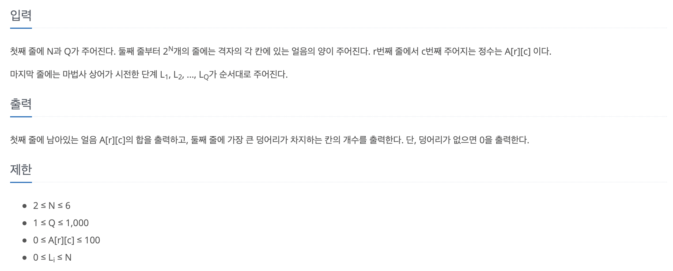1 2 3 4 5 6 7 8 9 10 11 12 13 14 15 16 17 18 19 20 21 22 23 24 25 26 27 28 29 30 31 32 33 34 35 36 37 38 39 40 41 42 43 44 45 46 47 48 49 50 51 52 53 54 55 56 57 58 59 60 61 62 63 64 65 66 67 68 69 70 71 72 73 74 75 76 77 78 79 80 81 82 83 84 85 86 87 88 89 90 91 92 93 94 95 96 97 98 99 100 101 102 103 104 105 106 107 108 109 110 111 112 113 114 115 116 117 | #include<iostream> #include<queue> #include<algorithm> using namespace std; int N, Q, L; int map[65][65]; bool visit[65][65]; bool map2[65][65]; queue<int> q; int dx[4] = {-1, 1, 0, 0}; int dy[4] = {0, 0, -1, 1}; int cnt; void rotate() { if (L == 0) return ; for(int i=1; i<= (1 << N); i++) for(int j=1; j<= (1 << N); j++) q.push(map[i][j]); for(int k=1; k<= (1 << N); k += (1 << L)) //묶음 개수 { for(int x=0; x<(1<<L); x++) { for(int i= (1 << L) - x; i<= (1 << N); i += (1 << L)) { for(int l= 0; l < (1 << L); l++) { int tmp = q.front(); q.pop(); map[k + l][i] = tmp; } } } } } void dfs(int x, int y) { visit[x][y] = 1; cnt++; for(int i=0; i<4; i++) { int nx = x + dx[i]; int ny = y + dy[i]; if (nx <= 0 || ny <= 0 || nx > (1 << N) || ny > (1 << N)) continue; if (map[nx][ny] != 0 && !visit[nx][ny]) dfs(nx, ny); } } int main() { cin.tie(NULL); ios_base::sync_with_stdio(false); cin >> N >> Q; int total = 0; int res = 0; for(int i=1; i<= (1 << N); i++) for(int j=1; j<= (1 << N); j++) { cin >> map[i][j]; total += map[i][j]; visit[i][j] = false; } for(int i=0; i<Q; i++) { cin >> L; rotate(); for(int j=1; j<= (1<<N); j++) for(int k=1; k<= (1<<N); k++) map2[j][k] = false; for(int j=1; j<= (1<<N); j++) { for(int k=1; k<= (1<<N); k++) { if (map[j][k] > 0) { int flag = 0; for(int l=0; l<4; l++) { int nx = j + dx[l]; int ny = k + dy[l]; if (nx <= 0 || ny <= 0 || nx > 1<<N || ny > 1<<N) continue; if (map[nx][ny] > 0) flag++; } if (flag <= 2) map2[j][k] = true; } } } for(int j=1; j<= (1 <<N); j++) for(int k=1; k<= (1 <<N); k++) if(map2[j][k] == true) { map[j][k]--; total--; } } printf("%d\n", total); for(int i=1; i<=1 <<N; i++) { for(int j=1; j<=1 <<N; j++) { if (!visit[i][j] && map[i][j] != 0) { cnt = 0; dfs(i, j); } res = max(res, cnt); } } printf("%d\n", res); return (0); } | cs |