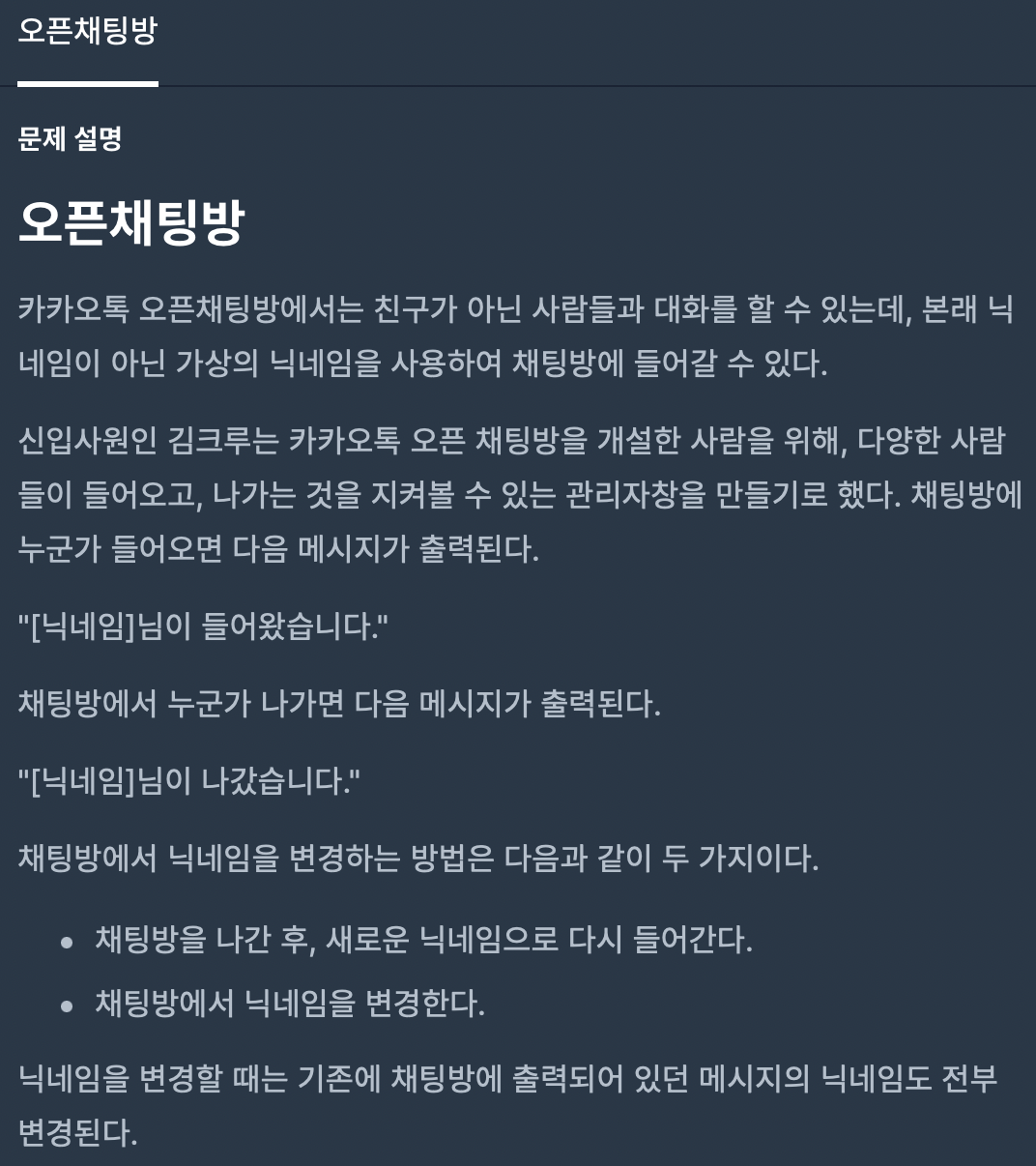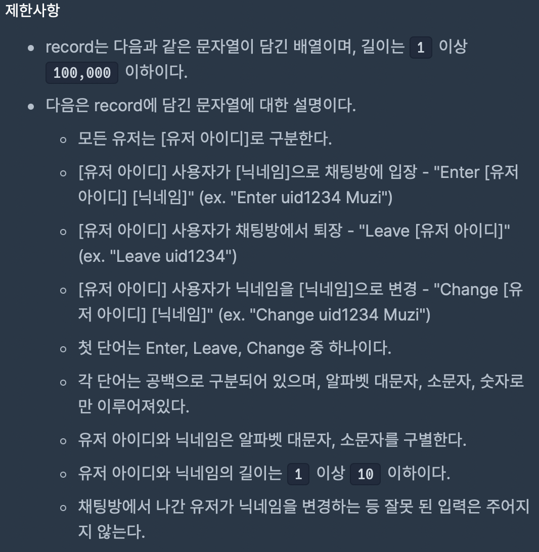 map 자료구조를 이용한 간단한 구현문제였다. uid별로 사용자를 구분하고, 각 uid에 해당하는 nickname을 미리 map에 저장 해놓는다.