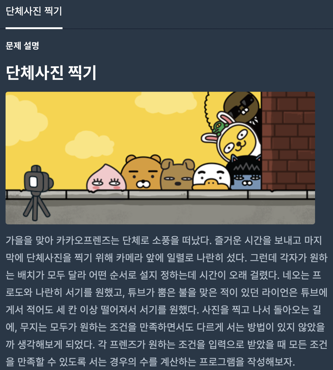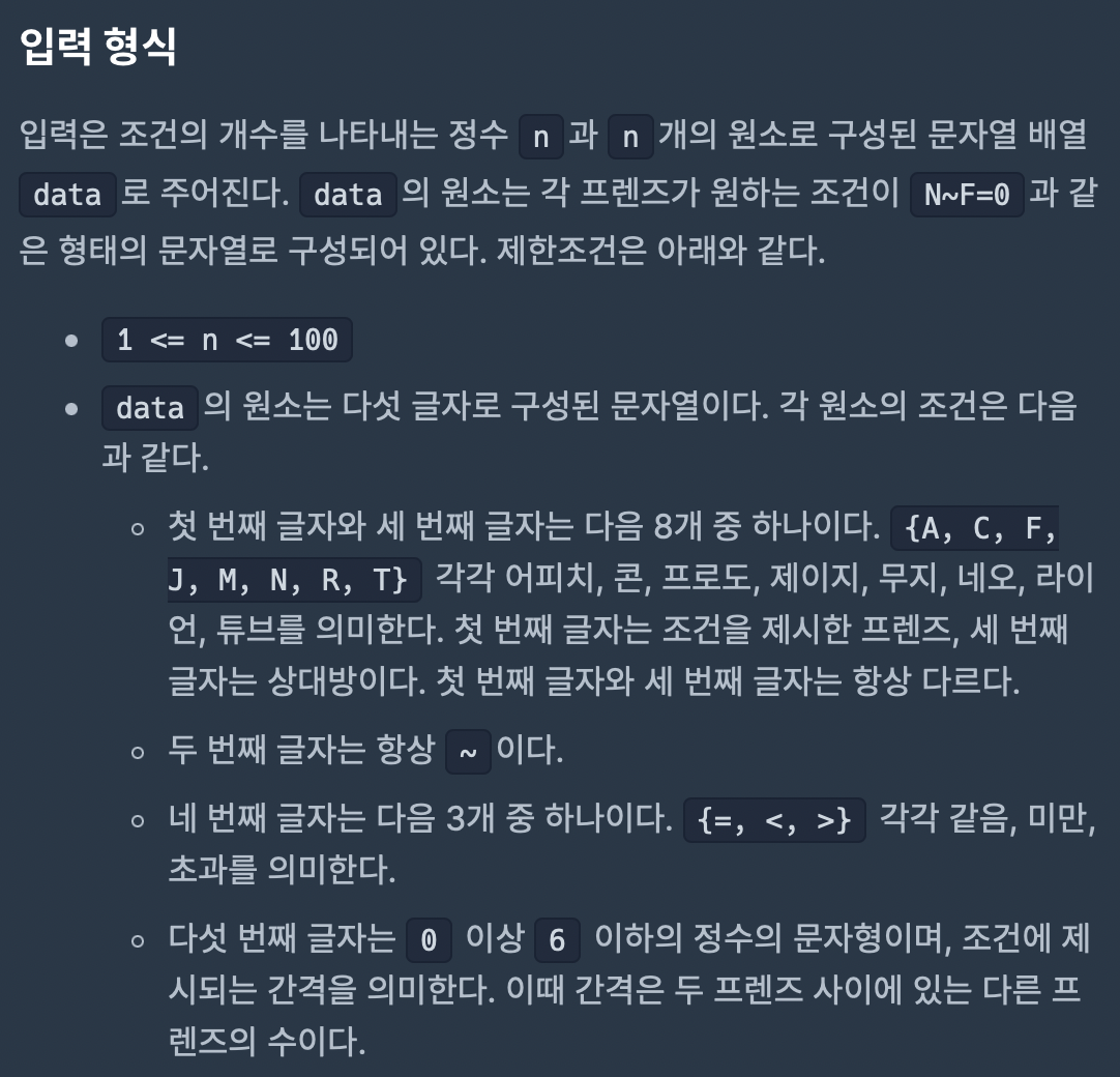 단체사진을 찍는 인원은 우선 총 8명이고 8명이 설 수 있는 경우의 수는 총 8! = 40320개이다. 그 중 최대 100개의 조건을 만족하는 순서쌍의 개수를 구하는 것이 문제이다.