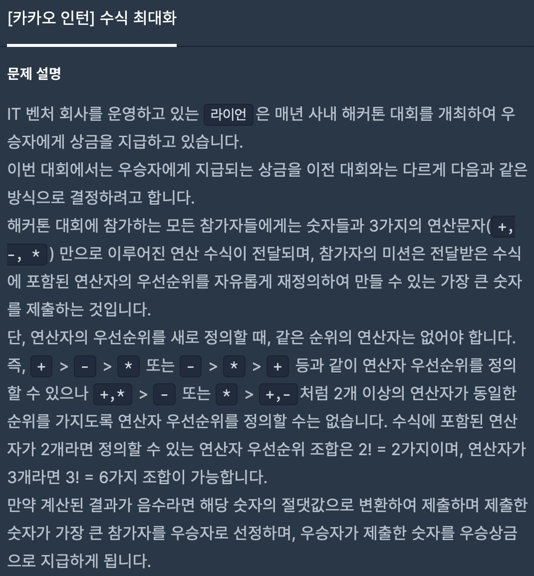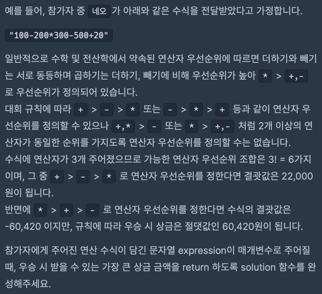 string을 *+-로 해두고 3!의 경우에 대해서 모두 계산해보는 방법을 사용했는데, 처음에 *를 expression에서 다 찾아서 계산하고, +, - 순으로 계산하는 방법을 생각했다.