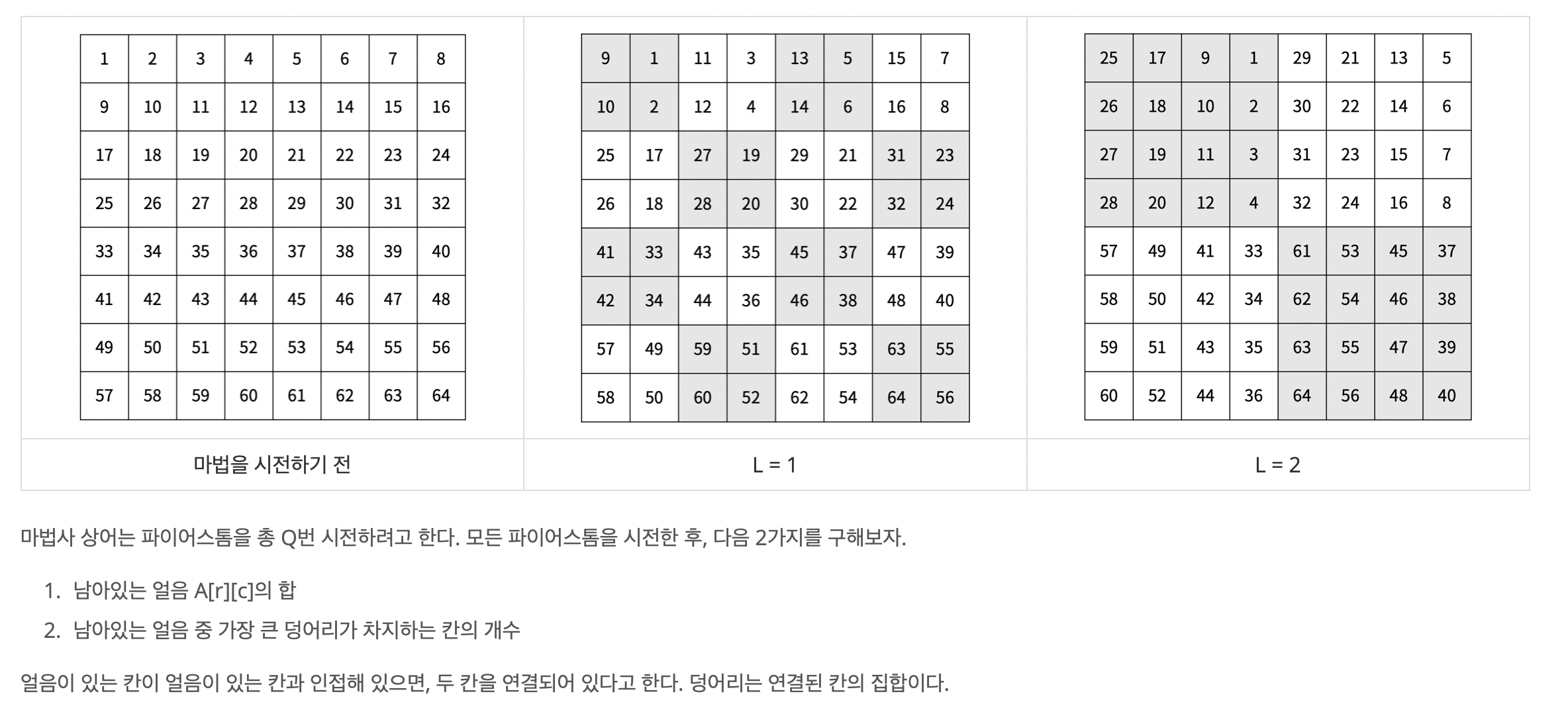 1 2 3 4 5 6 7 8 9 10 11 12 13 14 15 16 17 18 19 20 21 22 23 24 25 26 27 28 29 30 31 32 33 34 35 36 37 38 39 40 41 42 43 44 45 46 47 48 49 50 51 52 53 54 55 56 57 58 59 60 61 62 63 64 65 66 67 68 69 70 71 72 73 74 75 76 77 78 79 80 81 82 83 84 85 86 87 88 89 90 91 92 93 94 95 96 97 98 99 100 101 102 103 104 105 106 107 108 109 110 111 112 113 114 115 116 117 | #include<iostream> #include<queue> #include<algorithm> using namespace std; int N, Q, L; int map[65][65]; bool visit[65][65]; bool map2[65][65]; queue<int> q; int dx[4] = {-1, 1, 0, 0}; int dy[4] = {0, 0, -1, 1}; int cnt; void rotate() { if (L == 0) return ; for(int i=1; i<= (1 << N); i++) for(int j=1; j<= (1 << N); j++) q.push(map[i][j]); for(int k=1; k<= (1 << N); k += (1 << L)) //묶음 개수 { for(int x=0; x<(1<<L); x++) { for(int i= (1 << L) - x; i<= (1 << N); i += (1 << L)) { for(int l= 0; l < (1 << L); l++) { int tmp = q.front(); q.pop(); map[k + l][i] = tmp; } } } } } void dfs(int x, int y) { visit[x][y] = 1; cnt++; for(int i=0; i<4; i++) { int nx = x + dx[i]; int ny = y + dy[i]; if (nx <= 0 || ny <= 0 || nx > (1 << N) || ny > (1 << N)) continue; if (map[nx][ny] != 0 && !visit[nx][ny]) dfs(nx, ny); } } int main() { cin.tie(NULL); ios_base::sync_with_stdio(false); cin >> N >> Q; int total = 0; int res = 0; for(int i=1; i<= (1 << N); i++) for(int j=1; j<= (1 << N); j++) { cin >> map[i][j]; total += map[i][j]; visit[i][j] = false; } for(int i=0; i<Q; i++) { cin >> L; rotate(); for(int j=1; j<= (1<<N); j++) for(int k=1; k<= (1<<N); k++) map2[j][k] = false; for(int j=1; j<= (1<<N); j++) { for(int k=1; k<= (1<<N); k++) { if (map[j][k] > 0) { int flag = 0; for(int l=0; l<4; l++) { int nx = j + dx[l]; int ny = k + dy[l]; if (nx <= 0 || ny <= 0 || nx > 1<<N || ny > 1<<N) continue; if (map[nx][ny] > 0) flag++; } if (flag <= 2) map2[j][k] = true; } } } for(int j=1; j<= (1 <<N); j++) for(int k=1; k<= (1 <<N); k++) if(map2[j][k] == true) { map[j][k]--; total--; } } printf("%d\n", total); for(int i=1; i<=1 <<N; i++) { for(int j=1; j<=1 <<N; j++) { if (!visit[i][j] && map[i][j] != 0) { cnt = 0; dfs(i, j); } res = max(res, cnt); } } printf("%d\n", res); return (0); } | cs |
